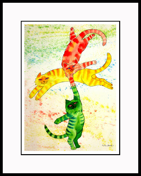 This talented cat threesome looks like they are right out of a wonderful circus act, ready to perform right in the comfort of your own home Guaranteed to please all the young-at-heart. Overall size: 18" x 23" incl. 2 3/4" mat. Each print is hand signed, titled & numbered with matching Certificate of Authenticity. All prints are shrink wrapped with a white mat and foamcore backing. Designer Frames are black aluminum with plexiglas.