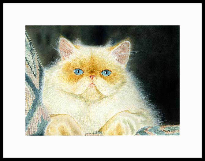Amaretto Framed Open Edition Mini Print of an original Drew Strouble cat art watercolor of a Flame Point Himalayan cat. Open Edition Mini Prints. Overall size: 9 3/4" x 11 5/8" incl. 2" mat. Each print is hand signed and titled.All prints are shrink wrapped with a white mat and foamcore backing. Designer Frames are black aluminum with plexiglas.