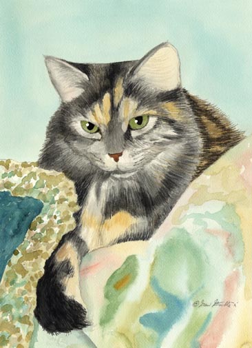 Ashes Matted Limited Edition of an original Drew Strouble cat art painting of a long-haired green-eyed Dilute Calico cat. Limited Edition of: 50 Artist's Proofs. Overall size: 14 1/2" x 18" incl. 2 1/2" mat. Each print is hand signed, titled & numbered with matching Certificate of Authenticity. All prints are shrink wrapped with a white mat and foamcore backing.