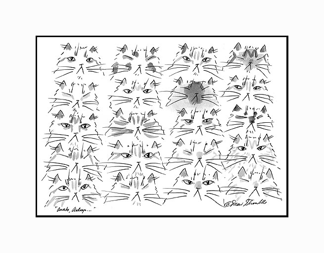 Awake, Asleep Limited Edition of an original Drew Strouble cat art ink drawing of 20 cats sleeping and 20 cats awake in a cartoon cat style. Limited edition of 950 Prints I Overall size: 14 1/2" x 18" incl. 2 1/1" mat. I Each print is hand signed, titled & numbered with matching Certificate of Authenticity. All prints are shrink wrapped with a white mat and foamcore backing.