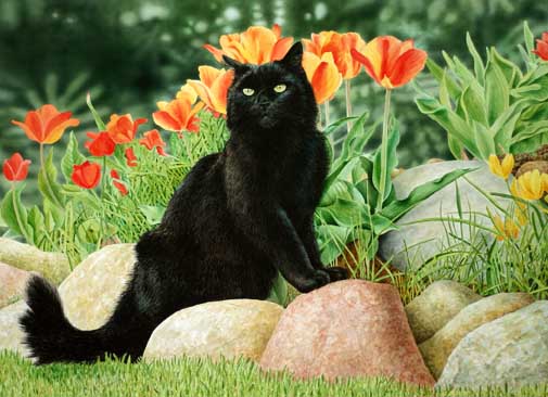 Baby Card of an original Drew Strouble cat art watercolor painting of a Black cat in a rock and tulip garden. Fine Art Greeting Card. Hand mounted Art Print on 5 x 7" white card. Blank inside. Matching envelope and clear protective packet included.