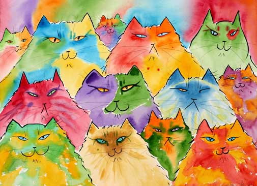 Baker's Dozen an original Drew Strouble cat art painting of thirteen wonderfully whimsical and very colorful cats. Fine Art Greeting Card. Hand mounted Art Print on 5" x 7" white card. Blank inside. Matching envelope and clear protective packet included.