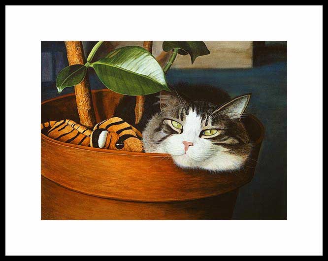 This compelling Tabby Cat mix lounging in a leafy planter with a Beanie Baby stuffed tiger is a beloved signature piece.
