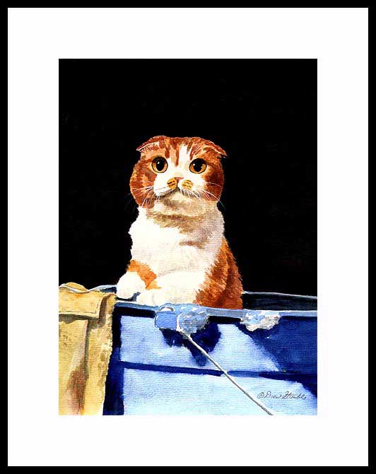 Bath Time Framed Artist's Proof of an original Drew Strouble cat art painting of a Scottish Fold cat taking a bath. Limited Edition of: 50 Artist's Proofs • Overall size: 14 1/2" x 18" incl. 2 1/2" mat. • Each print is hand signed, titled & numbered with matching Certificate of Authenticity. All prints are shrink wrapped with a white mat and foamcore backing. Designer Frames are black aluminum with plexiglas.