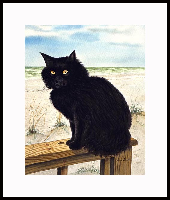 Beach Cat Framed Artist's Proof of an original Drew Strouble cat art painting of a black cat at the beach. Limited Edition of: 50 Artist's Proofs I Overall size: 14" x 16 3/8" incl. 2 1/2" mat. I Each print is hand signed, titled & numbered with matching Certificate of Authenticity. All prints are shrink wrapped with a white mat and foamcore backing. Designer Frames are black aluminum with plexiglas.