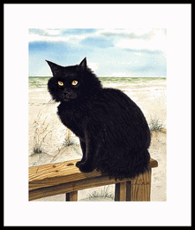 Beach Cat Framed Limited Edition Print of an original Drew Strouble cat art painting of a black cat at the beach. Limited Edition of: 950 Prints I Overall size: 14" x 16 3/8" incl. 2 1/2" mat. I Each print is hand signed, titled & numbered with matching Certificate of Authenticity. All prints are shrink wrapped with a white mat and foamcore backing. Designer Frames are black aluminum with plexiglas.