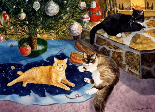 The Best for Last Matted Medium Open Edition of an original Drew Strouble cat art painting of an orange tabby cat, a black and white cat and a ragdoll by the Christmas tree. Open Edition Medium Prints I Overall size: 14 1/2" x 18" incl. 2 1/2" mat. I Each print is hand signed and titled. All prints are shrink wrapped with a white mat and foamcore backing. Designer Frames are black aluminum with plexiglas.