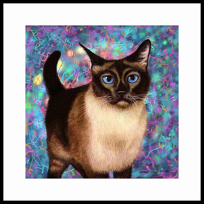 Big Bang Theory Revisited Framed Open Edition Mini Print of an original Drew Strouble cat art painting of Seal Point Siamese cat. Open Edition Mini Prints I Overall size: 10" x 10" incl. 1 1/2" mat. I Each print is hand signed and titled. All prints are shrink wrapped with a white mat and foamcore backing. Designer Frames are black aluminum with plexiglas.