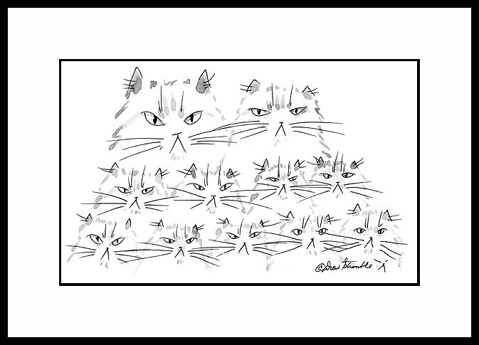 Big Litter is an original Drew Strouble Cat Art ink and wash drawing of a cat family portraying a very big litter of kittens, available as a Custom Original and as a print in several sizes, matted or framed.Big Litter<br>by Drew StroubleBig Litter