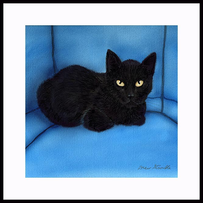 Black on Blue Framed Open Edition Mini Print of an original Drew Strouble cat art watercolor painting in a palette of 3 colors featuring a golden-eyed black cat on a blue chair available in fine art prints. Open Edition Mini Prints I Overall size: 10 x 10" incl. 2" mat. I Each print is hand signed and titled. All prints are shrink wrapped with a white mat and foamcore backing. Designer Frames are black aluminum with plexiglas.