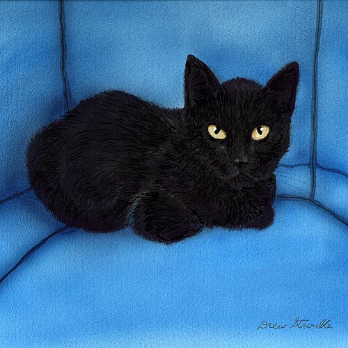 Black on Blue Matted Open Edition Mini Print of an original Drew Strouble cat art watercolor painting in a palette of 3 colors featuring a golden-eyed black cat on a blue chair available in fine art prints. Open Edition Mini Prints. Overall size: 10 x 10" incl. 2" mat. Each print is hand signed and titled. All prints are shrink wrapped with a white mat and foamcore backing.