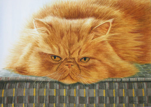 Red Persian Cat portrait by Drew Strouble. Fine Art Greeting Card. Hand mounted Art Print on 5" x 7" white card. Blank inside. Matching envelope and clear protective packet included.