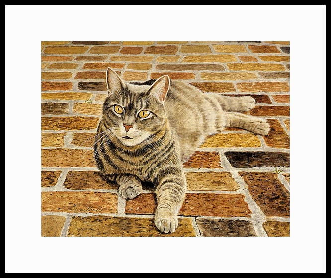 The Brickyard Framed Artist's Proof of an original Drew Strouble tabby cat art painting of a bright-eyed and beloved brown Tabby basking in sun washed tones on a beautiful brickyard. Limited Edition of: 50 Artist's Proofs I Overall size: 14" x 16 3/8" incl. 2 1/2" mat. I Each print is hand signed, titled & numbered with matching Certificate of Authenticity. All prints are shrink wrapped with a white mat and foamcore backing. Designer Frames are black aluminum with plexiglas.