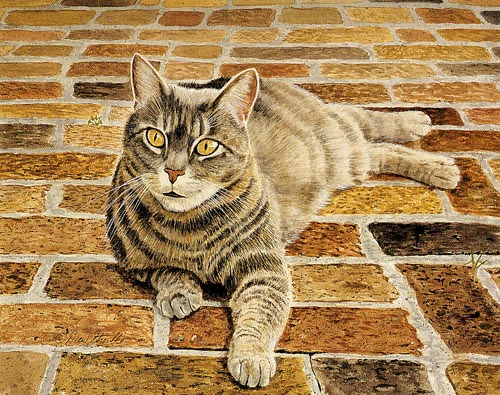 The Brickyard Matted Limited Edition of an original Drew Strouble tabby cat art painting of a bright-eyed and beloved brown Tabby basking in sun washed tones on a beautiful brickyard. Limited Edition of: 950 Prints. I Overall size: 14" x 16 3/8" incl. 2 1/2" mat. I Each print is hand signed, titled & numbered with matching Certificate of Authenticity. All prints are shrink wrapped with a white mat and foamcore backing.