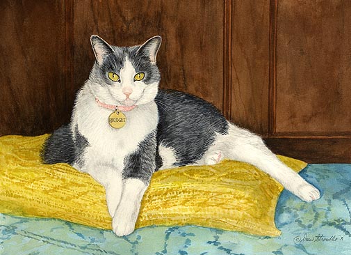 Bridget Matted Open Edition Mini Print of an original Drew Strouble cat art watercolor painting of a beautiful gray and white bicolor cat. Open Edition Mini Prints. Overall size: 9 3/4" x 11 5/8" incl. 2" mat. Each print is hand signed and titled.All prints are shrink wrapped with a white mat and foamcore backing.