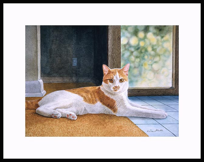 Buckwheat Framed Open Edition Mini Print of an original Drew Strouble cat art painting of an Orange and White Tabby Cat. Open Edition Mini Prints I Overall size: 9 3/4" x 11 5/8" incl. 2" mat. I Each print is hand signed and titled. All prints are shrink wrapped with a white mat and foamcore backing. Designer Frames are black aluminum with plexiglas.