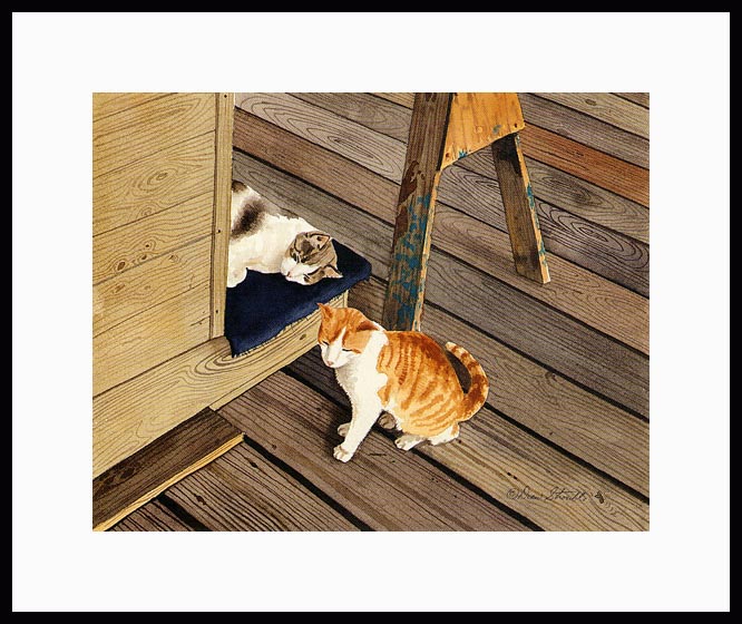Buddy Cats Framed Open Edition Mini Print of an original Drew Strouble cat art watercolor an orange and white tabby cat mix and a brown and white tabby cat mix on a fishing dock. Open Edition Mini Prints I Overall size: 8 7/8" x 10" incl. 2" mat. I Each print is hand signed and titled. All prints are shrink wrapped with a white mat and foamcore backing. Designer Frames are black aluminum with plexiglas.
