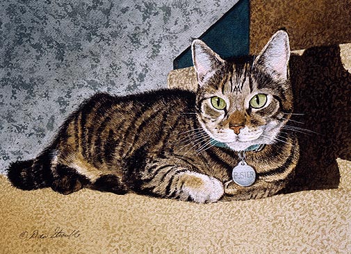 Buster Card of an original Drew Strouble Cat Art portrait of a brown tabby cat at the foot of a staircase. Fine Art Greeting Card I Hand mounted Art Print on 5" x 7" white card. I Blank inside. I Matching envelope and clear protective packet included.