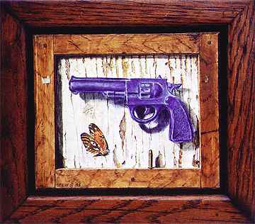 Butterfly Blues Card of an original Trompe l'Oeil Oil painting by Drew Strouble of a toy cowboy gun, peeling paint and a butterfly. Fine Art Greeting Card Hand mounted Art Print on 5" x 7" white card. Blank inside. Matching envelope and clear protective packet included.