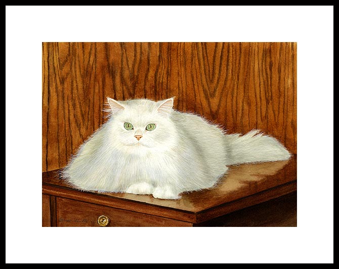 Camolot Framed Limited Edition of an original Drew Strouble cat art watercolor painting of a gorgeous White Persian Cat. Limited Edition of: 950 Prints. Overall size: 14 1/2" x 18" incl. 2 1/2" mat. Each print is hand signed, titled & numbered with matching Certificate of Authenticity. All prints are shrink wrapped with a white mat and foamcore backing. Designer Frames are black aluminum with plexiglas.