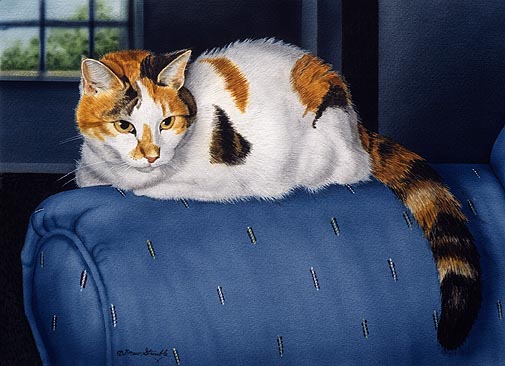 Cali Matted Limited Edition of an original Drew Strouble cat art watercolor painting a calico cat on a blue sofa. Limited Edition of: 950 Prints. I Overall size: 14 1/2" x 18" incl. 2 1/2" mat. I Each print is hand signed, titled & numbered with matching Certificate of Authenticity. All prints are shrink wrapped with a white mat and foamcore backing.