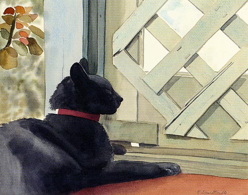Captive Royalty Card of an original Drew Strouble art watercolor painting of a Russian Blue or Gray Cat. Fine Art Greeting Card I Hand mounted Art Print on 5" x 7" white card. I Blank inside. I Matching envelope and clear protective packet included.