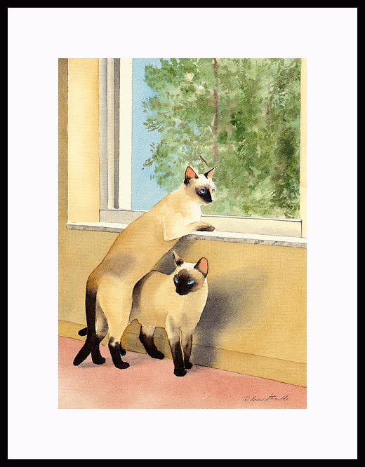Hi Drew, Coincidentally, we have a male seal point Siamese named Rocky! These will make a total of 6 of your Siamese prints we have. I was excited to find color ink prints in a shop in Siesta Key while on vacation in Sarasota in June this year. We first heard of you on our vacations over the years there. We have 3 seal point Siamese: Rocky and siblings Toby and Macy. "Meezers" has a particular place of honor on our mantel over the fireplace and is my favorite. Love your Meezers! Thanks, Drew. -Renee