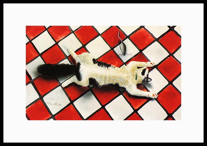 Checkmate Framed Open Edition Mini Print of an original Drew Strouble cat art watercolor painting of a black and white cat and a catnip mouse on a red and white checkerboard. Open Edition Mini Prints I Overall size: 12 7/8 x 9 5/8 incl. 2" mat. I Each print is hand signed and titled. All prints are shrink wrapped with a white mat and foamcore backing. Designer Frames are black aluminum with plexiglas.