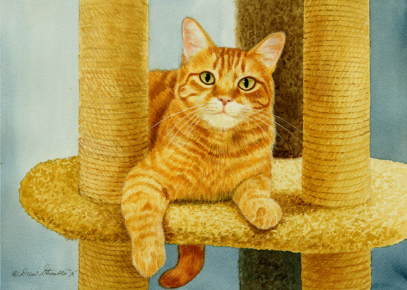 Chester - Fine Art Greeting Card • Hand mounted Art Print on 5" x 7" folded white card stock. • Blank inside. • Matching envelope and clear protective packet included. Image depicts a cat art painting of a fabulous orange tabby cat named Chester sitting on a cat perch looking at the viewer.