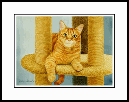 Framed Artist's Proof of an original Drew Strouble cat art painting of a fabulous orange tabby cat named Chester sitting on a cat perch looking at the viewer Limited to only 50 Artist's Proofs. Overall size Approx.: 14 1/2" x 18" incl. 2 1/2" mat. Each print is hand signed, titled & numbered with matching Certificate of Authenticity. All prints are shrink wrapped with a white mat and foamcore backing. Frame is black anodized aluminum with Plexiglas wired and ready to hang and enjoy!