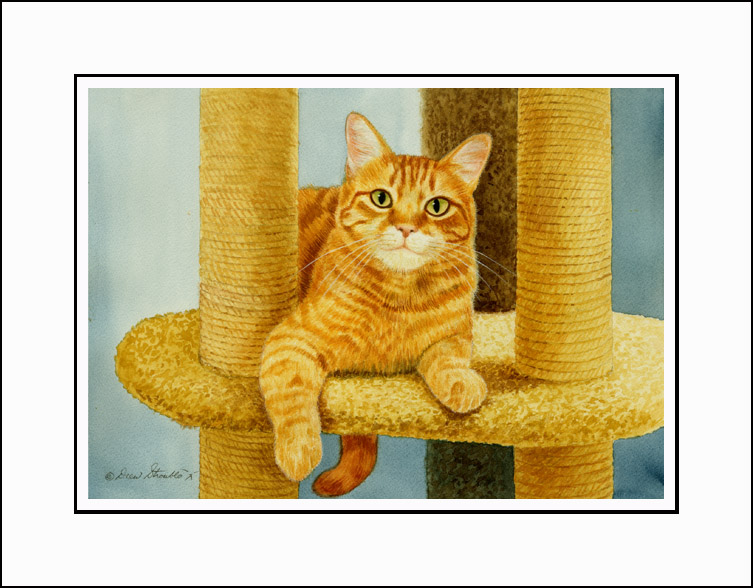 Matted Limited Edition of an original Drew Strouble cat art painting of a fabulous orange tabby cat named Chester sitting on a cat perch looking at the viewer. Limited to 50 Artist's Proofs. Overall size Approx.: 14 1/2" x 18" incl. 2 1/2" mat. Each print is hand signed, titled & numbered with matching Certificate of Authenticity. All prints are shrink wrapped with a white mat and foamcore backing.