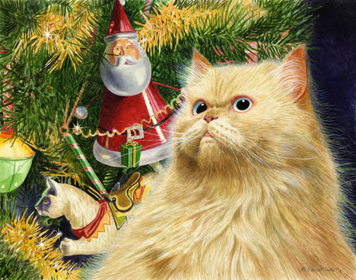 Matted Mini Print of an original Drew Strouble cat art painting of a wonderfully detailed Flame Point Himalayan cat at Christmas time. Overall size 9 3/4 x 11 5/8 inches. White mat, foamcore backing all shrink wrapped and ready for framing.