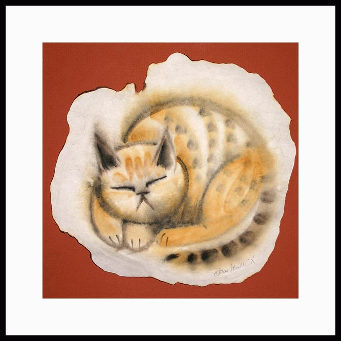 Cozy Cat Framed Limited Edition of an original Drew Strouble cat art painting of sleeping tabby cat painted on rice paper in a square format. Limited Edition of: 50 Artist's Proofs. Overall size: 18" x 18" incl. 2 3/4" mat. Each print is hand signed, titled & numbered with matching Certificate of Authenticity. All prints are shrink wrapped with a white mat and foamcore backing. Designer Frames are black aluminum with plexiglas.