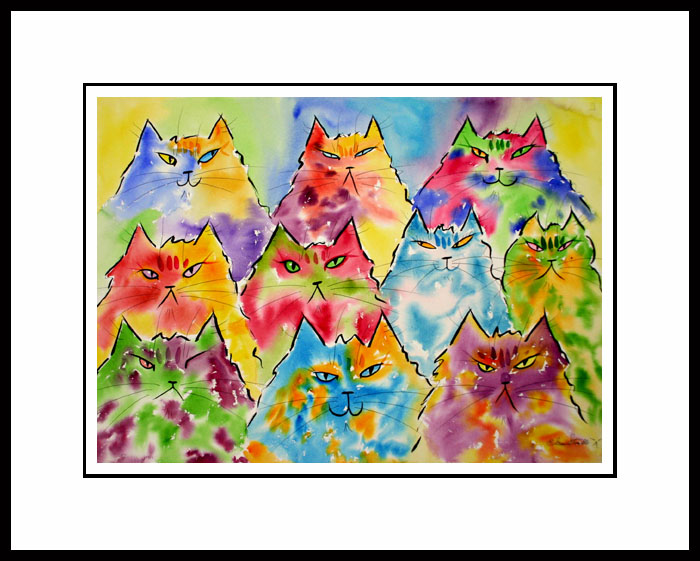 The framed full sheet original watercolor sold the on 7/20/08. The image size was 23 x 30 inches and is matted and framed at 33 x 40 inches. Price was $1295.00 plus shipping. If you would like a similar watercolor original, I can create one just for you for the same price using your favorite colors! Call toll free. 1.800.349.MEOW (6369) to find out how!