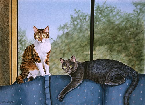 Couch Potatoes Card of an original Drew Strouble cat art watercolor painting of a gray tabby cat and a brown and white tabby cat on a sofa.