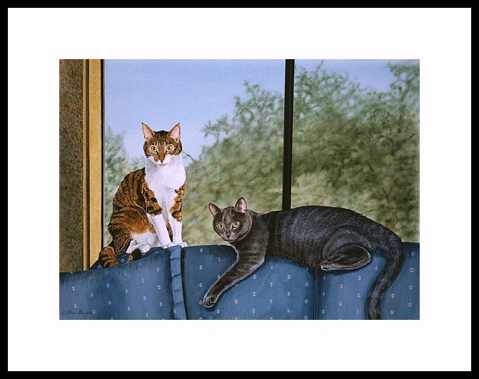 Couch Potatoes Framed Open Edition Mini Print of an original Drew Strouble cat art watercolor painting of a gray tabby cat and a brown and white tabby cat on a sofa.