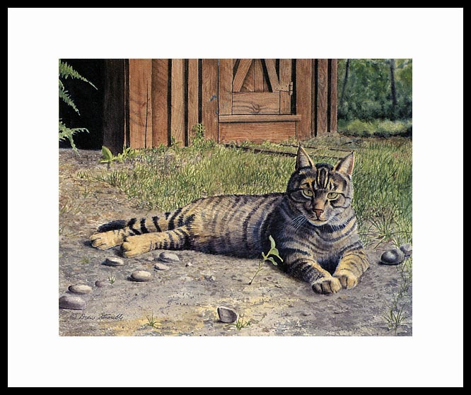 Country Gentleman Framed Open Edition Mini Print of an original Drew Strouble cat art painting of a farm Tabby Cat in front of a barn. Open Edition Mini Prints I Overall size: 8 7/8" x 10" incl. 2" mat. I Each print is hand signed and titled. All prints are shrink wrapped with a white mat and foamcore backing. Designer Frames are black aluminum with plexiglas.