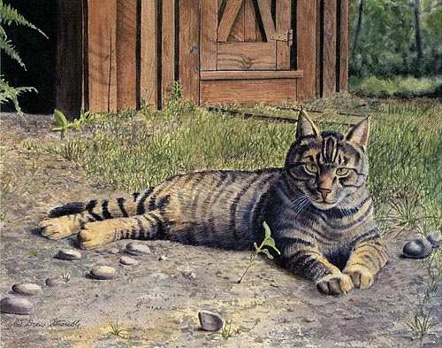 Country Gentleman Matted Open Edition Mini Print of an original Drew Strouble cat art painting of a farm Tabby Cat in front of a barn. Open Edition Mini Prints I Overall size: 8 7/8" x 10" incl. 2" mat. I Each print is hand signed and titled. All prints are shrink wrapped with a white mat and foamcore backing.