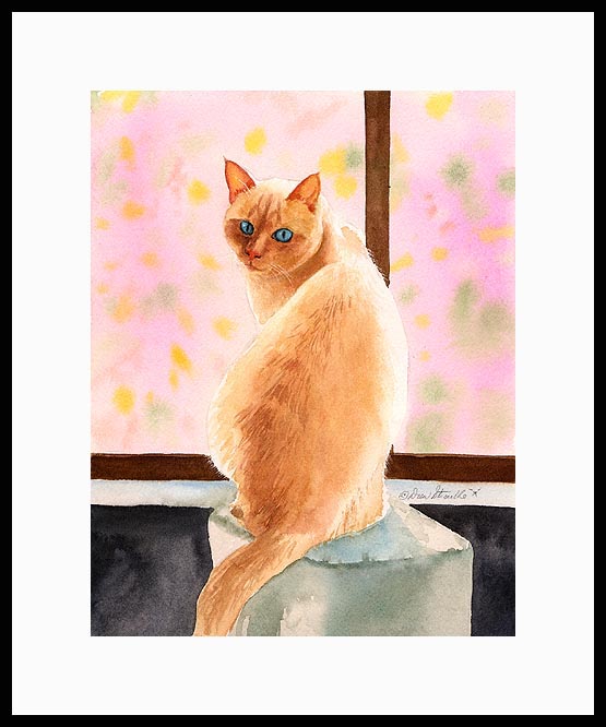 Cream Puff Framed Open Edition Mini Print of an original Drew Strouble cat art watercolor painting of a flamepoint Siamese mix, orange and white cat looking over its shoulder. Open Edition Mini Prints • Overall size: 9 3/4" x 11 5/8" incl. 2" mat. • Each print is hand signed and titled. All prints are shrink wrapped with a white mat and foamcore backing. Designer Frames are black aluminum with plexiglas.