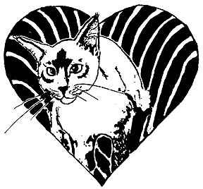 Siamese mix in a heart shape graphic. Black and White graphic drawing originally created for the Siamese Rescue Alliance 2001 Calendar featuring the artwork of Drew Strouble.