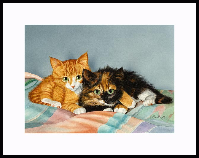 Cuddle Bums by cat artist Drew Strouble. Framed Artist's Proof Print of an original Drew Strouble cat art watercolor painting of a Tortoise Shell Calico kitten and an Orange Tabby kitten. Limited Edition of: 50 Artist's Proofs • Overall size: 14 1/2" x 18" incl. 2 1/2" mat. • Each print is hand signed, titled & numbered with matching Certificate of Authenticity. All prints are shrink wrapped with a white mat and foamcore backing. Designer Frames are black aluminum with plexiglas.