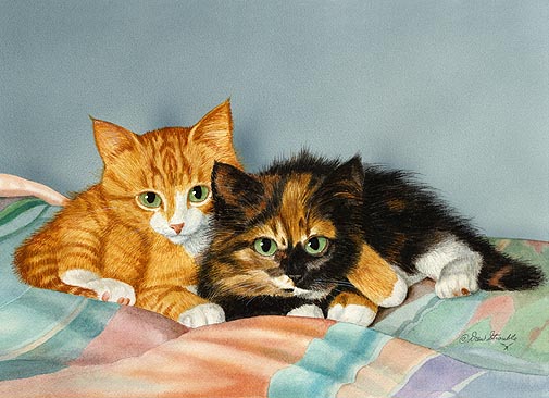 Cuddle Bums Card by cat artist Drew Strouble. Hand mounted Art Card of an original Drew Strouble cat art watercolor painting of a Tortoise Shell Calico kitten and an Orange Tabby kitten.
