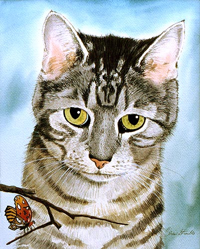 Curious Matted Open Edition Mini Print of an original Drew Strouble cat art watercolor painting of a Tabby Cat looking at a butterfly. Open Edition Mini Prints I Overall size: 8 7/8" x 10" incl. 2" mat. I Each print is hand signed and titled. All prints are shrink wrapped with a white mat and foamcore backing.