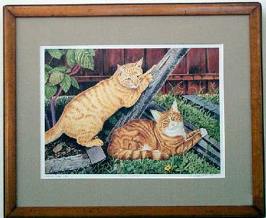 Vintage Honey-colored Maple framing embraces this Drew Stouble Tabby Cat Art honey and marmelade colored tabby twosome.