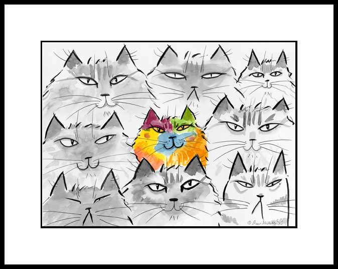 Go ahead! Be yourself! Dare to be Different like this daring colorful feline who's not afraid to show off it's true colors. This will make the purrfect inspirational gift for yourself or that special friend in need of a good laugh and smile each new day.. This cat art print verison by Drew Strouble is a Framed Limited Edition with an overall size of 14 1/2" x 18" including a 2 1/2" white mat with a black beveled edge. Designer Frames are black aluminum with plexiglas. Limited edition of only 950 prints.