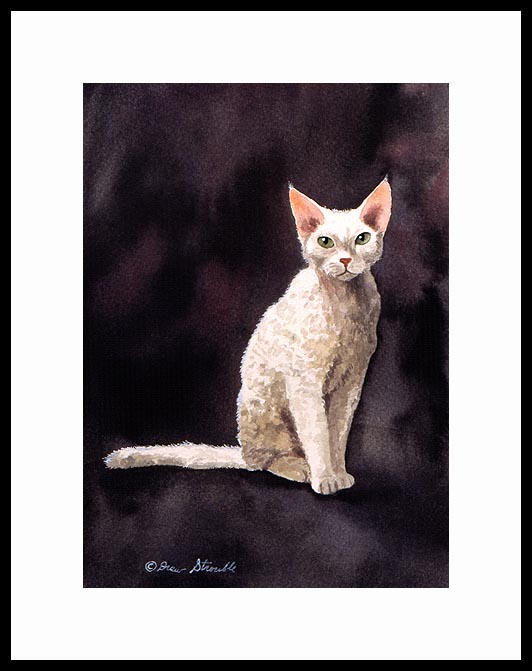 Devon Rex Framed Mini Print of an original Drew Strouble Devon Rex cat art painting of a Pearl White Devon Rex. Open Edition Mini Prints I Overall size: 9 3/4" x 11 5/8" incl. 2" mat. I Each print is hand signed and titled. All prints are shrink wrapped with a white mat and foamcore backing. Designer Frames are black aluminum with plexiglas.
