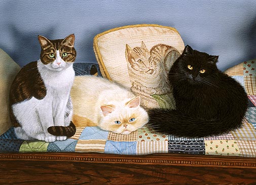 Don't Leave Card of an original Drew Strouble cat art painting of a a tabby cat, a flamepoint Himalayan and a fluffy black cat nestled on a patchwork quilt. Fine Art Greeting Card I Hand mounted Art Print on 5" x 7" white card. I Blank inside. I Matching envelope and clear protective packet included.