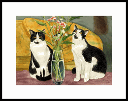 Double Trouble Framed Artist's Proof of an original Drew Strouble cat art watercolor painting of two domestic bicolor black-white cats. Limited Edition of: 50 Artist's Proofs. Overall size: 14 1/2" x 18" incl. 2 1/2" mat. Each print is hand signed, titled & numbered with matching Certificate of Authenticity. All prints are shrink wrapped with a white mat and foamcore backing. Designer Frames are black aluminum with plexiglas.