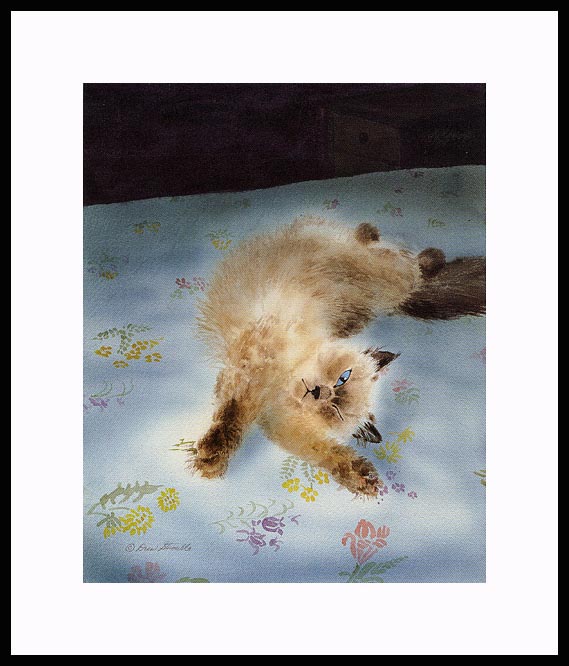 Dream Chaser Framed Artist's Proof of an original Drew Strouble Himalayan cat art painting of a blue point or lilac point Himalayan cat in a flying kitty pose on a bed. Limited Edition of: 50 Artist's Proofs I Overall size: 14" x 16 3/8" incl. 2 1/2" mat. I Each print is hand signed, titled & numbered with matching Certificate of Authenticity. All prints are shrink wrapped with a white mat and foamcore backing. Designer Frames are black aluminum with plexiglas.