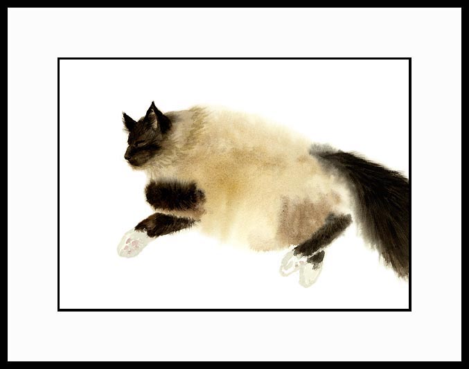Dream Hunting Framed Limited Edition of an original Drew Strouble cat art watercolor painting of a Birman cat hunting in his sleep. Limited Edition of: 950 Prints. I Overall size: 14 1/2" x 18" incl. 2 1/2" mat. I Each print is hand signed, titled & numbered with matching Certificate of Authenticity. All prints are shrink wrapped with a white mat and foamcore backing. Designer Frames are black aluminum with plexiglas.